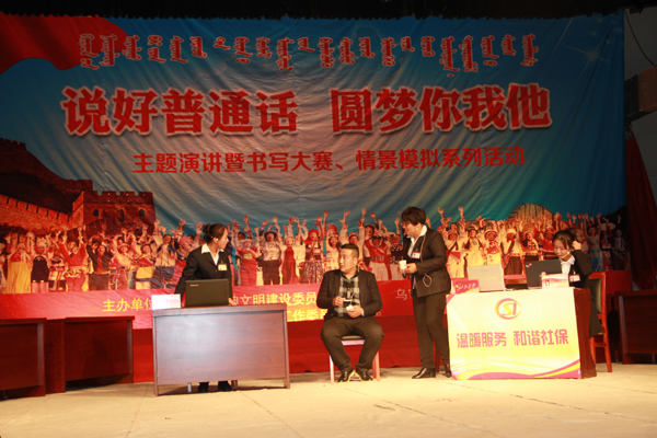 为喜迎国庆、重阳双节,9月30日下午,乌审旗文明办、乌审旗书协、乌审旗汉语委办在旗文化活动中心联合举办“说好普通话·圆梦你我他”主题演讲暨书写大赛、情景模拟系列活动,在全社会普及“说普通话写规范字用文明语做文明人”的意识和应用水平,弘扬中华民族尊老、敬老、孝老的传统美德,营造“人人都讲普通话,处处都用规范字”的良好语言文字环境。