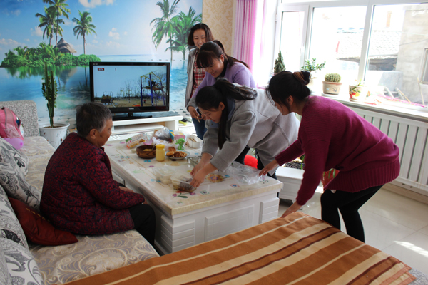 经过一阵忙碌,女孩们将一叠叠饭菜端上桌子,你争我抢的帮老人们盛上米饭,白奶奶说“这种感觉真的太好了,你们就像我自己的孩子们,真亲切。”将这里饭局安排好后,志愿者们又不停歇的拿着早已打包好的饭盒为另外五位行动不方便的老人送去这份“爱心午餐”。