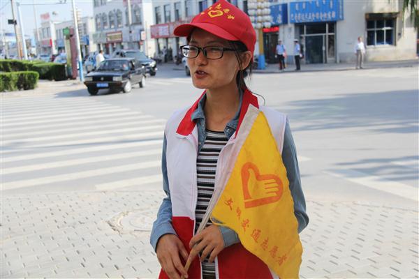 文明交通志愿者与交警共同指开展文明交通劝导工作