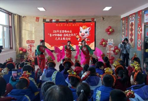 活动在喜庆的氛围中拉开序幕。“咱们的舞台”文艺表演志愿服务队以一支《红歌大联唱》扇子舞点燃全场热情。随后,乌审旗第一小学二年级学生带来充满童趣的舞蹈《新年yeah》,焕发着孩子们的蓬勃朝气。居民自编自演的小品《傻妞相亲》以其诙谐幽默的风格赢得阵阵欢笑。蒙古族查干爷爷和宝鲁特木尔爷爷深情献唱《阿拉腾沙拉》,悠扬的歌声传递着草原文化的独特魅力。演出结束后,孩子们为社区老人佩戴上温暖的围巾,这一暖心举动生动诠释敬老爱老的传统美德。
