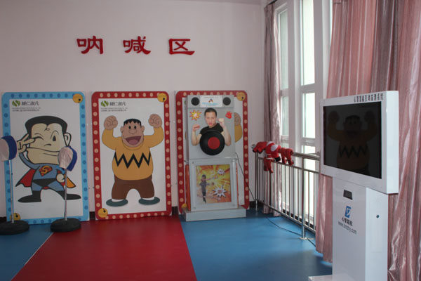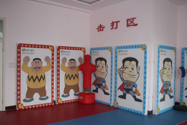 宣泄室分为击打区,呐喊区,涂鸦区,许愿区,里面提供了智能型宣泄人、硅胶宣泄人、宣泄不倒翁、智能呐喊宣泄仪、击打墙和心理宣泄系统。