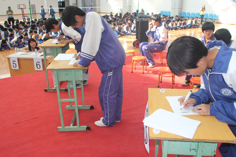 比赛分为两个环节,首先进行的是汉字听写大赛的海选。八年级全体学生经过海选,共有6个班级的18名同学脱颖而出,参加决赛。按照比赛规则,决赛书写时间为60秒,采用速听速答的方式进行比赛,在所有参加决赛的选手中,正确率最高、答题时间最短的即为本届听写大赛的冠军。决赛现场人声鼎沸,参赛选手各个摩拳擦掌,跃跃欲试。随着比赛的进行,台上的气氛越来越紧张,台下同学们的热情也越来越高涨,有的为参赛选手加油打气的,有的为参赛选手那不俗的实力所震惊的,当然也有为参赛选手而感到惋惜。随着比赛的深入,题目的难度也不断加大,现场气氛越来越紧张,最终经过两轮的比拼,产生了比赛的冠亚季军。
