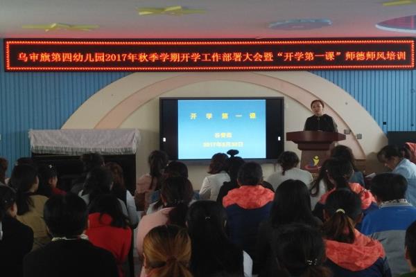(图为乌审旗第四幼儿园召开秋季开学部署大会暨“开学第一课”师德师风培训会)